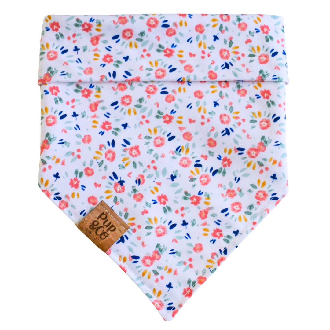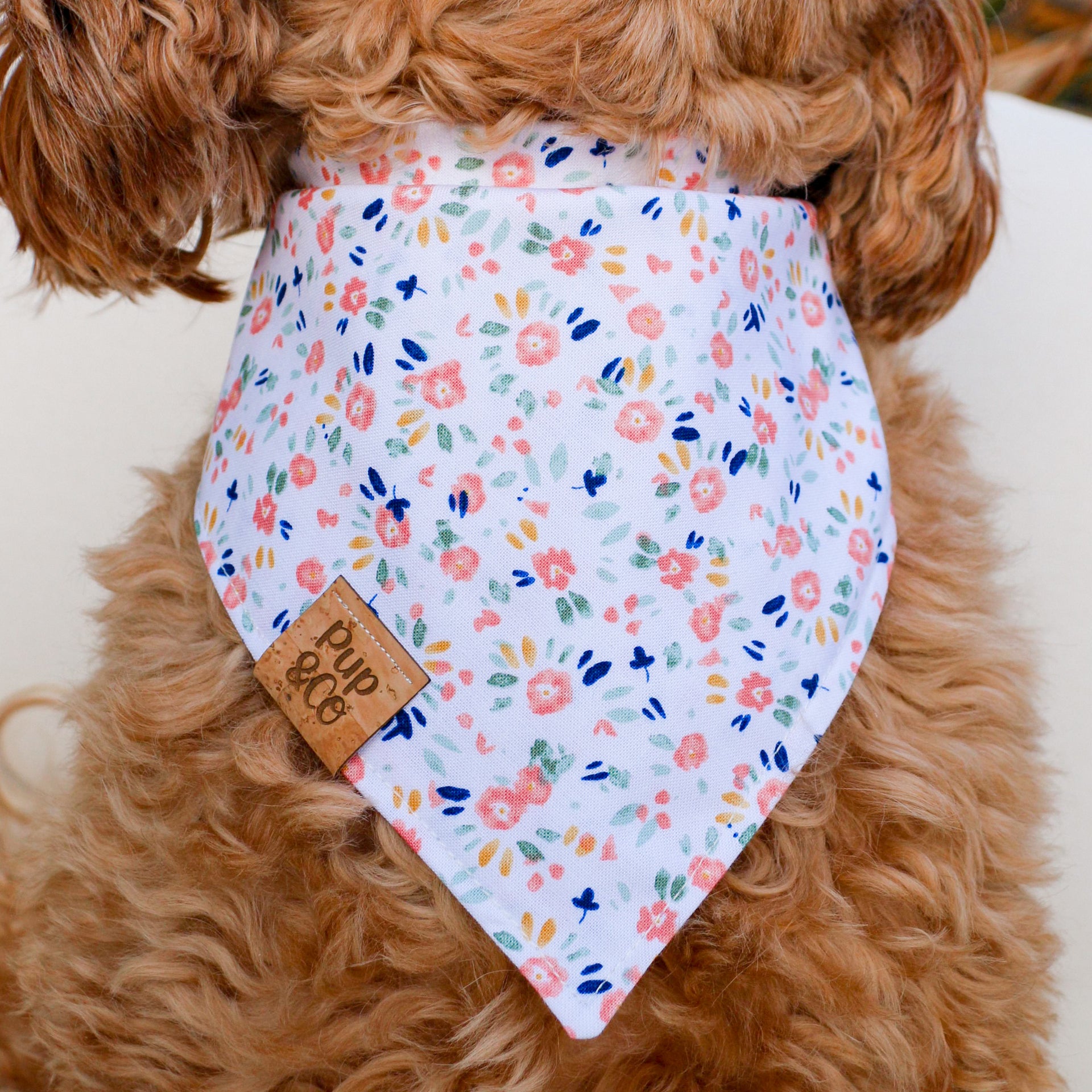 All of our bandanas are handmade with love from Arizona and quality assurance checked by our puppy Goldie. Our bandanas are triangle in shape and are meant to be knotted at the back around your pups neck or snapped. Please check out our size guide to find the perfect fit for your pup. Every bandana is 100% cotton and comes with our Pup & Co. label.