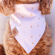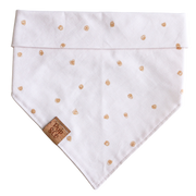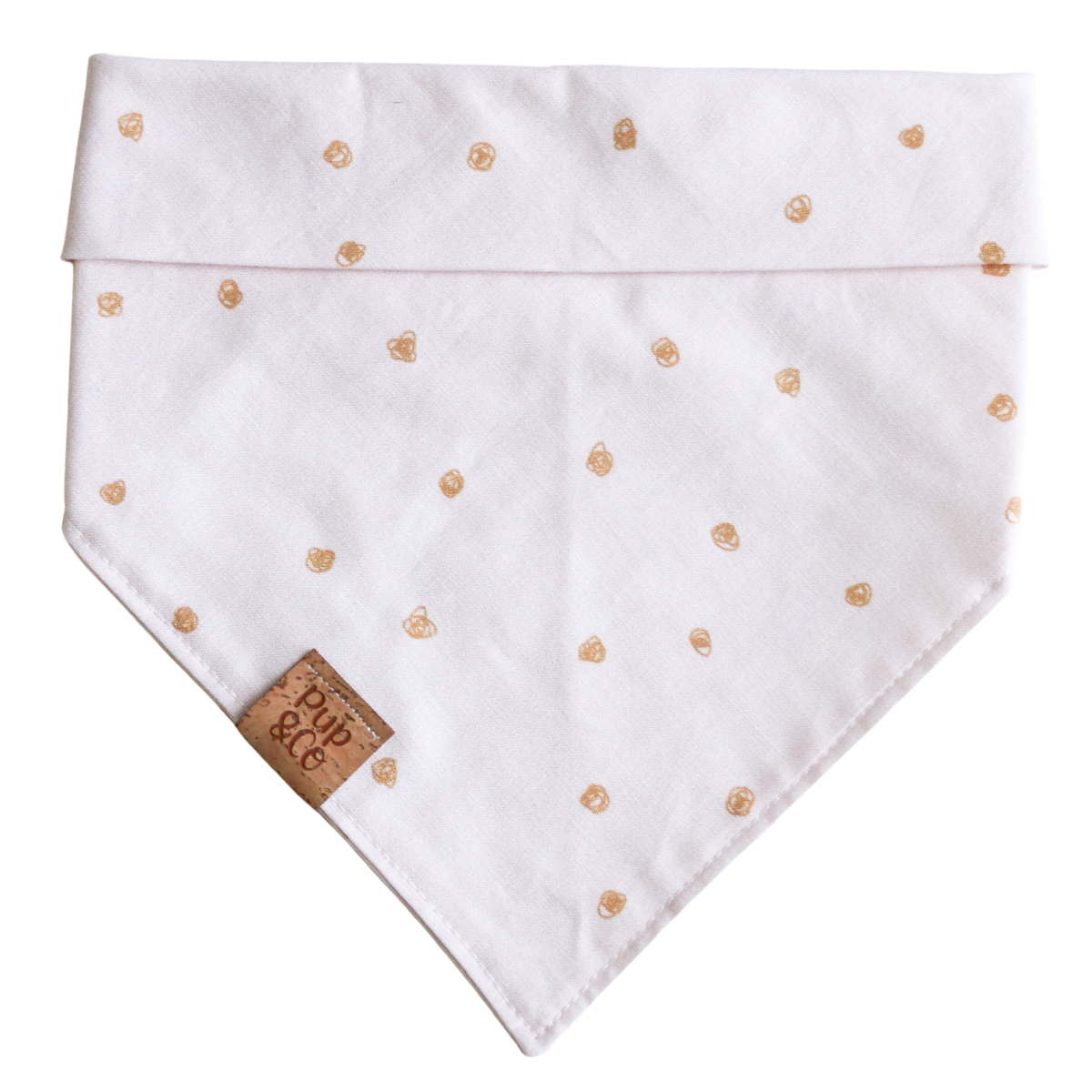 All of our bandanas are handmade with love from Arizona and quality assurance checked by our puppy Goldie. Our bandanas are triangle in shape and are meant to be knotted at the back around your pups neck or snapped. Please check out our size guide to find the perfect fit for your pup. Every bandana is 100% cotton and comes with our Pup & Co. label.