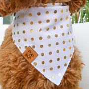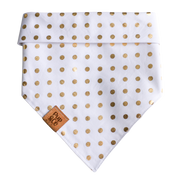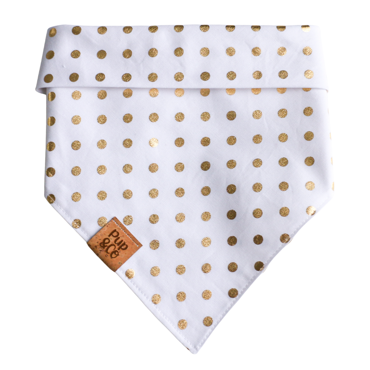 All of our bandanas are handmade with love from Arizona and quality assurance checked by our puppy Goldie. Our bandanas are triangle in shape and are meant to be knotted at the back around your pups neck or snapped. Please check out our size guide to find the perfect fit for your pup. Every bandana is 100% cotton and come with our Pup & Co. label.