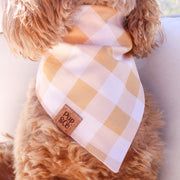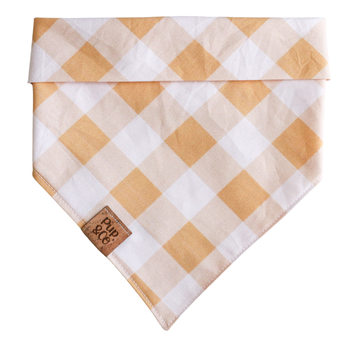 All of our bandanas are handmade with love from Arizona and quality assurance checked by our puppy Goldie. Our bandanas are triangle in shape and are meant to be knotted at the back around your pups neck or snapped. Please check out our size guide to find the perfect fit for your pup. Every bandana is 100% cotton and comes with our Pup & Co. label.