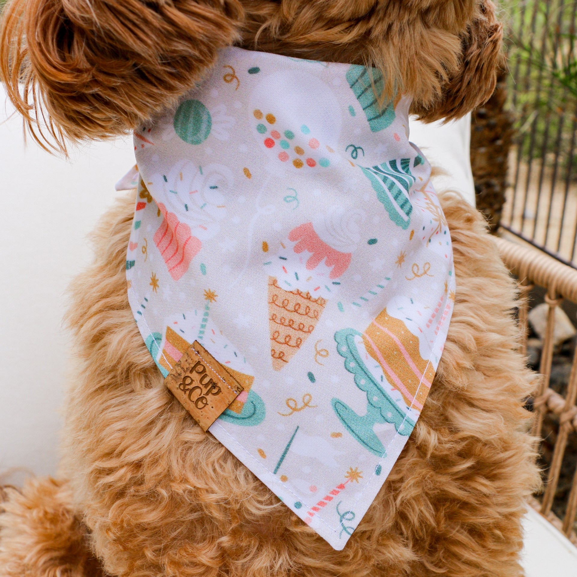 Measure your pup's neck before purchasing to ensure the proper sizing and fit. If your pup is fluffier or between sizes, consider sizing up for the best fit. If the bandana is a bit larger, fold down the top end as many times as necessary before tying it on. All of our bandanas come with an extra 3-4 inches of fabric from the "Up to # Neck" size to ensure the best knot when tying your bandana. Or we have the option to snap to secure the bandana. You could also tie the bandana once and snap to be extra secure.