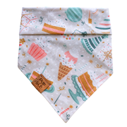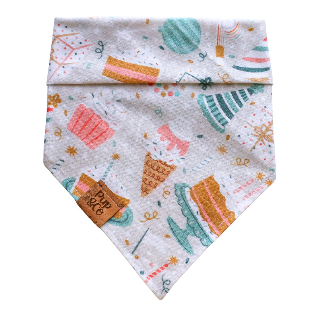 All of our bandanas are handmade with love from Arizona and quality assurance checked by our puppy Goldie. Our bandanas are triangle in shape and are meant to be knotted at the back around your pups neck or snapped. Please check out our size guide to find the perfect fit for your pup. Every bandana is 100% cotton and comes with our Pup & Co. label.